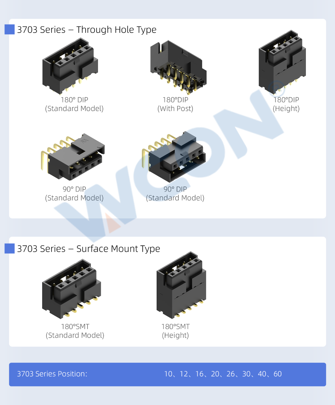 The 3703 Series connectors deliver outstanding performance. Operating reliably within a stringent temperature range of -55°C to +125°C, they ensure consistent signal transmission and enhance overall system reliability. Key characteristics including high rated voltage, low contact resistance, and high insulation resistance effectively suppress electrical interference, minimize power dissipation, and enhance electrical safety.